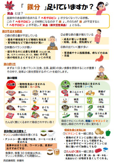 2025年11月1日 / 最終更新日 : 2025年10月31日 nishimuko-cl インフォメーション 【栄養科より】11月『「鉄分」足りていますか?』 栄養科では、栄養指導の一環として、患者様やご家族様にご覧いただけるよう、 待合室に病気予防や栄養についての情報を月ごとにお届けしております。 画像をクリックすると拡大できます。