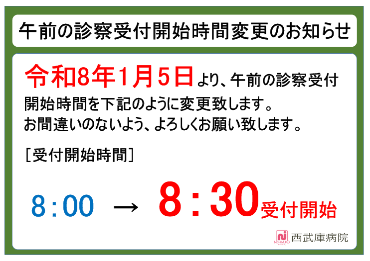 2025年11月20日 / 最終更新日 : 2025年11月20日 nishimuko-cl 一覧 《NEW》 令和8年1月5日より午前の診療受付開始時間が8時30分に変わります 画像をクリックすると拡大できます。