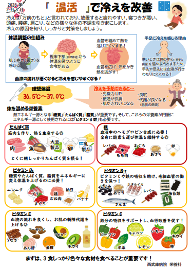 2026年2月1日 / 最終更新日 : 2026年1月30日 nishimuko-cl インフォメーション 【栄養科より】2月3月『温活』 栄養科では、栄養指導の一環として、患者様やご家族様にご覧いただけるよう、 待合室に病気予防や栄養についての情報を偶数月にお届けしております。 画像をクリックすると拡大できます。